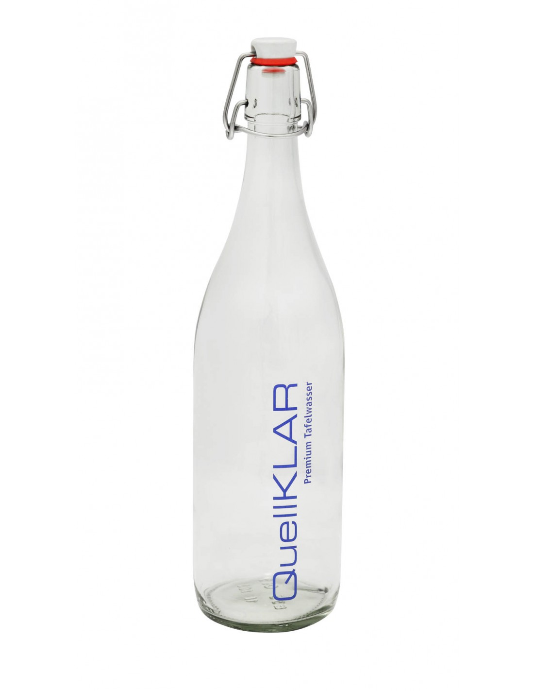 Formschöne Bügelflasche aus Glas mit Quellklar-Logo.