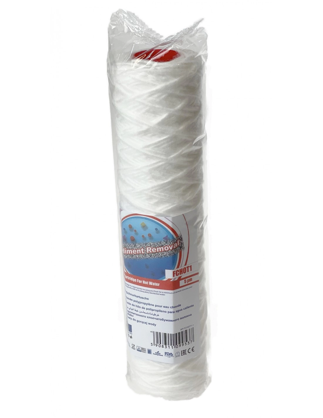Sedimentfilter für Heißwasser bis 93°C aus FDA-zugelassenem Polypropylengarn mit 5 Micron, das auf einen Polypropylenkern gewickelt ist, der die Kartusche verstärkt. Dieser Garn-Sedimentfilter zeichnet sich durch eine hervorragende Sedimentabsorption von Sand, Schlick, Rost und Schwebstoffen aus dem Brauch- und Trinkwasser aus.